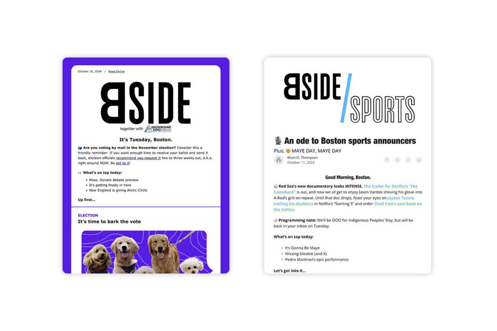 The B-Side is a free newsletter that delivers the daily dose of local news you need to know, while B-Side Sports keeps you in the know about Boston sports.